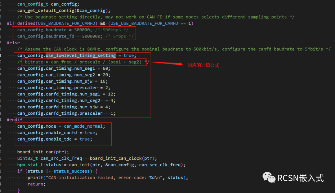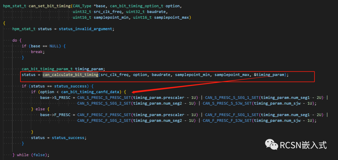 sdk的CAN驱动的波特率设置,写的比较贴心,提供了两种方式来设置。一种是直接代入实际的波特率,第二种是自己写入位时序参数。根据use_lowlevel_timing_setting这个变量来决定哪种方式。